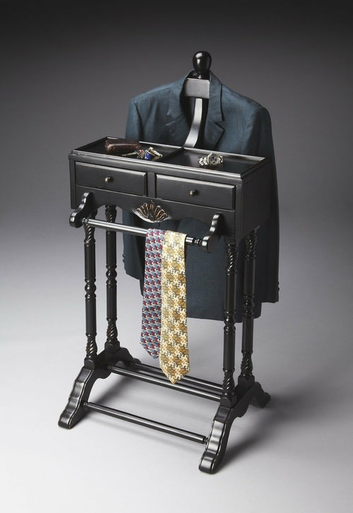 This elegant valet is a must for anyone with a flair for fashion. Hand crafted from solid hardwood, it features a scuptured wood hanger, ideal for a jacket, shirt or blouse; pants hanger, two drawers with antique brass finsihed hardware; and a top storage shelf.